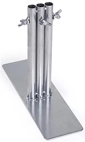 This 3 leg art display panel base efficiently functions as the center connector to create a three-way configurations including compatible gridwall systems sold separately. Customers can customize the painting and poster stands to showcase different sizes and styles of artwork. Each silver base offers a rectangular design for stability. In the center, three posts equipped with wingnuts allow for minor height adjustments and easy assembly. The base is great for setting up artwork and poster stands in a triangular pattern, because it can accommodate three gridwall pieces at once. Customers can order a variety of units to help create a custom showcase systems.