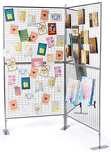 This “Y” shaped art display grid set is made from iron and has a stylish silver finish. The unique design allows each gridwall panel to face a different direction, drawing customer attention and creating extra exposure for your products. The metal display grid is ideal for showcasing artwork and other objects at craft fairs, gallery nights, and more. The display grid can also be used in retail environments to showcase lightweight objects such as purses, scarves, and other accessories. In addition, the set assembles in minutes and requires no tools, so it’s highly portable!