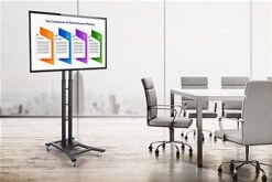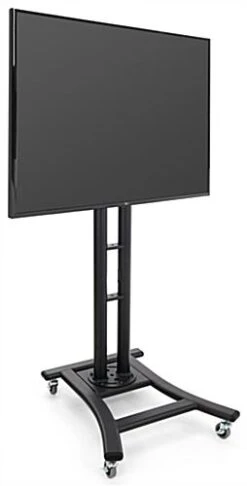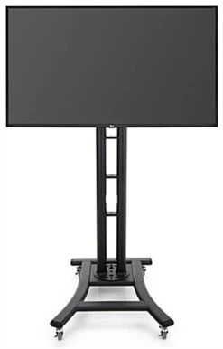This LED TV stand for floor has a height adjustable design, with (8) set heights ranging from 44″-71-1/5″ to perfectly position a flat screen monitor. The mounting bracket with adjustable extenders accommodates most flat screens between 37” and 65” that weigh less than 110 pounds. The VESA-compatible mount can even display monitors in landscape orientation. Additionally, the mounting bracket on this floor standing unit has a tilting design to angle a monitor up to 15 degrees. This black LED TV stand is equipped with locking wheels for effortless mobility throughout a room. Once the fixture is in place, simply lock the casters to prevent movement.