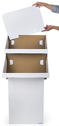 This corrugated display is a cardboard stand ideal for displaying overstock or clearance merchandise. All retailers have items that move slower than others. It is a huge challenge to find a cheap yet cost effective way to get slow moving items off the shelves. This cardboard stand is the answer to that problem. Inexpensive, yet attractive and durable, this display stand has two shelves for maximum displaying power. Bins that are 12″ deep allow you to display a high volume of small sized merchandise. The open design of this cardboard stand gives your patrons an unobstructed view of all merchandise placed in each bin! A 2″ lip on each shelf ensures merchandise does not fall off the unit. This cardboard stand called a corrugated display, or P.O.S. stand, has a white finish that fits into any décor. We supply this cardboard stand with a removable header as an added bonus!