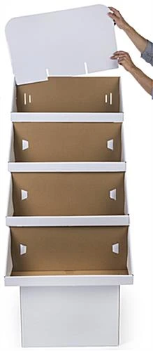 This retail cardboard stand is a great way to reduce inventory of slow-selling goods! The point of purchase stand is a floor-standing unit, designed to capture the eye of patrons. Also known as a sale bin, holds food, paper, and general merchandise. Floor units like these are often seen in a grocery store, highlighting new brands or seasonal items. The cardboard POP display is filled with cereal, crackers, juices, candy, DVDs, coffee and more. The stand is excellent for retailers looking for a versatile point of purchase rack, capable of showcasing different items throughout the store. Users often place the cardboard stand near a checkout counter to increase impulse purchase buys.