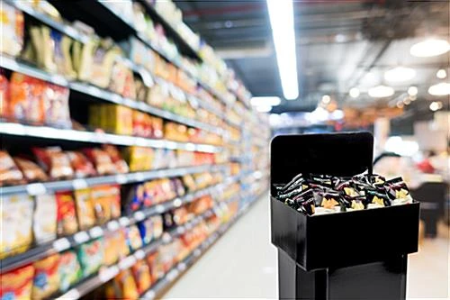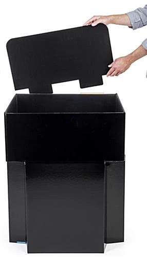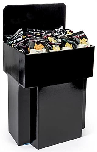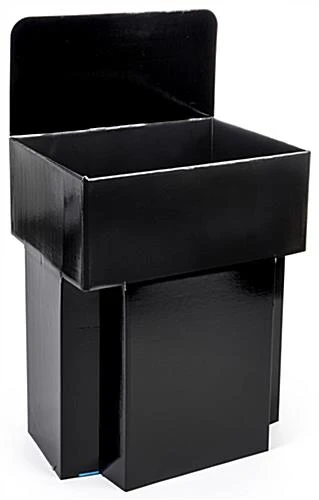 Cardboard containers, bulk bins are sturdy yet light weight, allowing them to be moved from place to place within your retail floor with ease. The bulk bins, such as the retail displays or merchandise containers, are usually placed at the end cap of an aisle or commonly placed near registers as a point of purchase stand. These bulk bins’ container dimensions are 23″w x 10″h x 17″d, which is perfect for candy, toys, and other small on sale items. The black shiny finish of the bulk bins is another way to gain customer attention. In the bulk bins, the products tend to stick out and attract interest of people walking by. Add or take away the bulk bins removable header for a customized look. Bulk bins are an economical choice for businesses who want to move excess inventory while not spending a lot of money on displays.