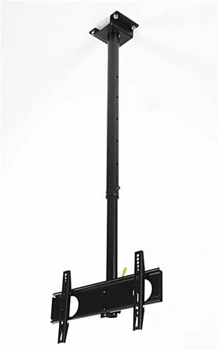 An LCD mount, that fits a 23″-42” screen, is designed for one large flat panel. The arm brackets can hold up to 110 pounds for a safe display. This LCD mount, also known as a flat panel accessory, features a 360° swivel. The plasma TV can be positioned at the ideal angle for visitors to view. An LCD mount, that is a ceiling bracket, also has a downward 15° tilt for arm adjustable ceiling height. The whole unit, including the bracket and pole, has a black finish. This ceiling monitor, LCD mount creates an attractive and effective display in a busy setting!