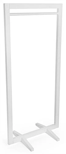 Display clothing on this square frame garment hanger stand for a modern store fixture. Featuring one clothes rail, each rack showcases a collection of inventory. The white frame garment hanger stand provides a complementary finish to your existing store fixtures. Display seasonal collections on the rack for a minimalist retail arrangement. A neutral white finish provides the perfect holder for merchandise. Update your store and create a contemporary look with this garment hanger stand.