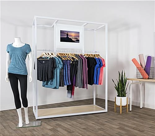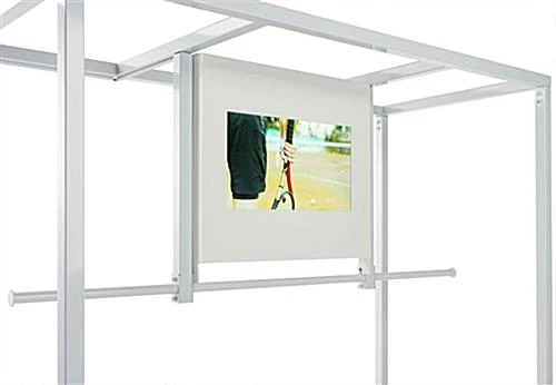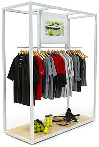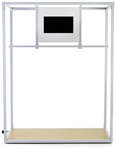 Our clothing rack with video screen is an ultra modern display solution perfect for retail stores, showrooms, trade shows, or any merchandising space with a tech-forward focus. Each 66 x 85 garment display features a white steel frame, weighted maple finish base and a 21.5″ digital display monitor with a built-in media player and speaker. In addition, each flatscreen has a 1920 x 1080 HD resolution that grants a vivid display of content and product advertising. Connect to the video screen clothing rack by opening the hinged privacy panel on the back, revealing the HDMI, SD card, and USB 2.0 ports. The partitioned rail on this garment display can feature a large arrangement of clothes while the base serves as additional space for back stocked merchandise or props. Use this clothing rack with video screen and its ultra modern design aesthetic to captivate shoppers with digital brand messaging today!
