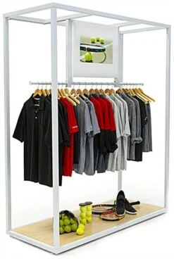 Clothing Rack with Video Screen and Maple Finish Base