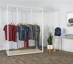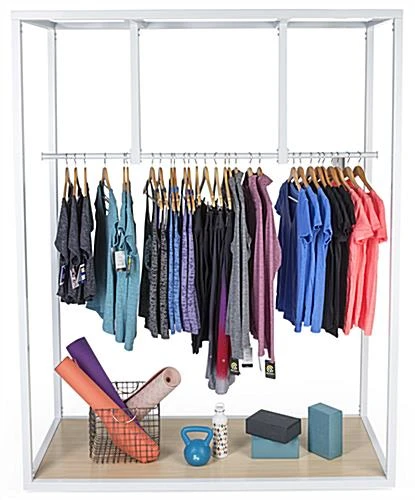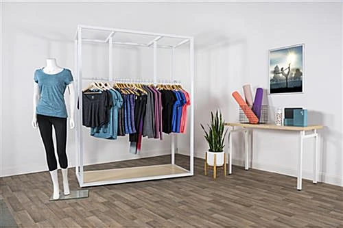 This boutique floor clothing hanger display provides your retail store with open concept visual merchandising. Each rack includes an oversized white steel frame and crisp maple finish MDF base. Customers can browse merchandise from either side of the white floor clothing hanger display. The garment rail includes 3 partitioned sections for your retail store inventory. Complete your arrangement and use the base for decorative pieces or extra merchandise customers can browse. Use this floor clothing hanger display as the perfect rack to attract traffic and showcase inventory!