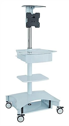Emergency rooms, doctor’s offices and other medical facilities have limited space with large equipment making this hospital computer cart essential. These mobile workstations feature 4” dual-wheels for easy maneuverability throughout your workplace. The rolling computer cart totes an adjustable frame allowing for employees of any height to work comfortably without straining their back. Two of the four wheels have built in brakes making the mobile workstation a safe product for when workers need to tend to a patient or enter information on the laptop or internal programs. Mounted on the cart above the universal screen mount is an adjustable camera platform for video conferencing. Also featured is a slide out drawer with a 25” work surface, great for your laptop and getting the patients information in efficiently and on time. This workstation also has a wire management system allowing you to neatly hide the wires while avoiding a tripping hazard. Power all of your multimedia devices safely with the Tripp Lite Medical surge protector which is located in the back of the base cabinet. The universal screen mount is easily adjustable by a lever located on the back.