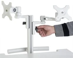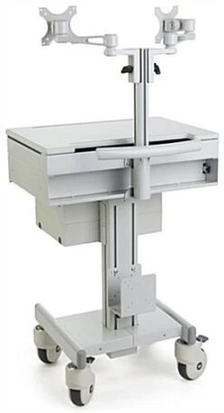 Built for everyday use, this medical computer trolley is a quality solution built from steel and MDF that promises durability. Used in many healthcare facilities, mobile carts can be wheeled from room to room to collect patient information. Sit or stand at this height adjustable computer trolley by simply pushing down on the foot pedal. Each workstation provides 2 VESA compliant mounts and a large working surface for laptops or other equipment. Additionally, integrated cable management and 3 drawers, 1 of which locks, make this computer trolley a professional looking solution for any environment. Keep your CPU from falling off the mobile cart with the included holder that adjusts to fit various sizes. Reap the ergonomic benefits of switching from sitting to standing in your healthcare facility.