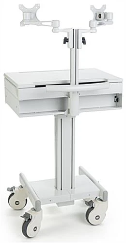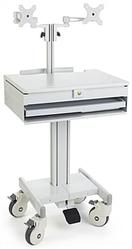 Sit or stand at this dual monitor medical cart by using the foot pedal to easily change the height to your preference. Each mobile computer trolley is built on 4 wheels that allow for full movement between rooms or lock the casters for a stationary solution. Use this healthcare cart in hospitals, doctor’s offices, and labs for an efficient and ergonomic way to work. The two mobile computer workstation mounts are VESA compatible and can accommodate screens ranging from 15” to 23” in size. Additionally, a pull-out keyboard and mouse holder accompanied by integrated cable management make this cart an organized solution for busy offices. This healthcare trolley also totes a large work area that is big enough to hold a 17” wide laptop!