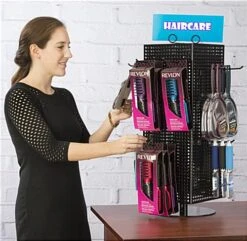 This black pegboard display stand is compatible with the 4” hook accessories sold on our site. The 4-sided store fixtures are also magnetic, giving retailers multiple options for showcasing products. The glossy metal stand is a great way to market jewelry, keepsake magnets, impulse buy items such as batteries or flashlights, and much more! Each of the tabletop store fixtures come with a rounded, rotating base that keeps the unit steady while multiple customers browse through products. Each stand includes a sign holder with a coil clip for holding pricing information or promotional graphics to entice buyers. The neutral color and glossy finish of the metal spinner rack will blend in well with existing retail fixtures, creating an attractive store appearance.