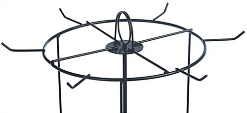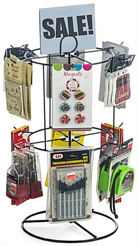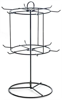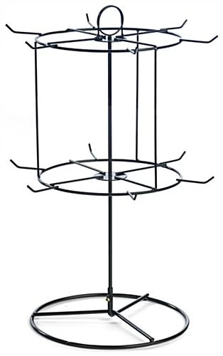 The countertop spinner display is a practical fixture for any storefront. Both wire rack tiers rotate a full 360° so customers can have a complete view of merchandise. The black spinner display requires little assembly and can be put together by attaching the pole to the base and sliding the top into place. With the pegs spaced 3” apart you can use the wire rack to showcase a wide variety of hanging retail items in your store. The spinner display has 2 tiers each with 6 hooks to hold a large amount of merchandise. This fixture can be used in your store to promote an bookmarks, snacks and other impulse items in a organized manner!