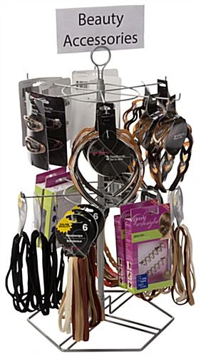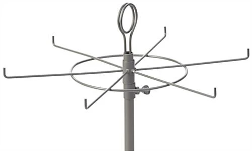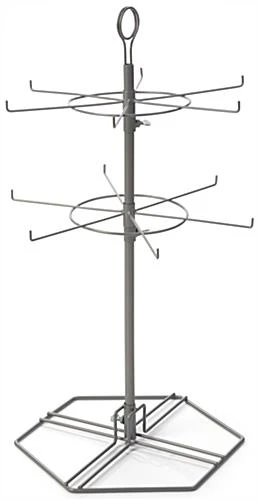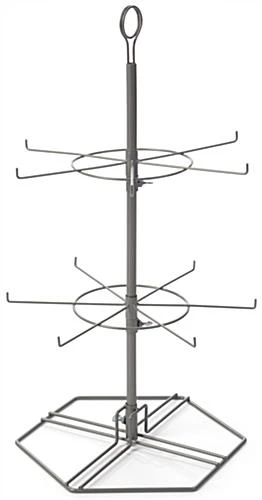 This wire spinner rack allows you to promote smaller hanging merchandise. With a 2 tier design, the counter display is perfect for your store’s point of purchase locations. The silver spinner rack features height adjustable supports to accommodate different sized products. Above the counter display is a coil sign holder to advertise in your own personal way. Each tier features 6 peg hooks for a total of 12 on the entire rack. Help to better promote your stores smaller accessories and order this fixture today!