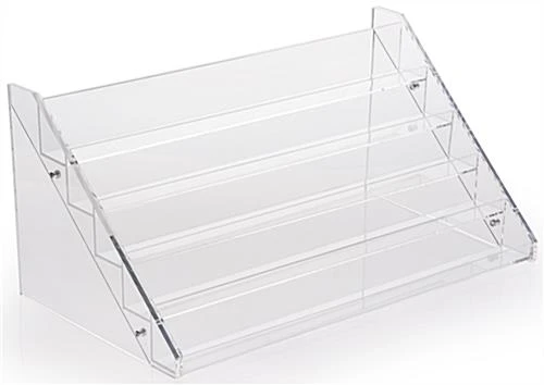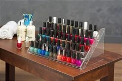 This nail polish stand is an ideal display organizer for a day spa salon, cosmetics supply store or retail store. Each 5-tiered clear acrylic fixture is designed to organize and showcase manicure lacquer bottles and other beauty accessories. This clear acrylic countertop nail polish stand is a compact rack capable of holding approximately (60) bottles on (5) shelves. Each tier features a lip to secure the fingernail glosses in place and accommodates various sizes and brands at one time, including OPI, China Glaze, Sinful Colors, and Essie. This lightweight 5-tier nail polish stand is a great way to showcase fingernail enamel and laquer colors in service environments, retail stores, and in trade show booths. The knock down design of this organizer allows the acrylic beauty display to be disassembled easily and occupy minimal space in storage. Each nail polish stand has 2″ deep shelves that allow it to easily hold a variety of bottle or product sizes as well as fingernail varnish.