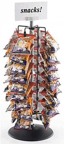 Use these spinning merchandise stands on retail countertops and and tabletops in other establishments such as gas stations, markets, dining halls, and cafes. With this fixture, hang up to 36 different products to prompt last-minute impulse buys at check out. These merchandise stands are a great compliment to large social events as well, simply outfit the unit with your functions favorite snacks using accessible bag clamps. This countertop model features a top-mounted sign holder, a great way to let customers know what is in display, the pricing, or any additional signage needed. For convenient viewing by store customers, this wire stand rotates. These merchandise stands allow retail customers to see packaged goods at checkout with ease, naturally increasing sales at checkout.
