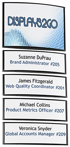 Often the first signage seen in the office lobby are building directory signs, providing an ideal way to guide visitors through your establishment. Available in black aluminum, each panel individually attaches to any wall with long-lasting VHB tape strips that run across the back. All that you need for installation is a level to ensure that these slender directory signs are straight and looking great for your reception area. Whenever a new employee is hired or a department relocates internally, the signage located in the office lobby can up updated with your own printed paper inserts. Using the included suction cup, the lenses snap out to make replacing the inserts even easier. These directory signs coordinate well on any wall and are a great addition to your lobby!