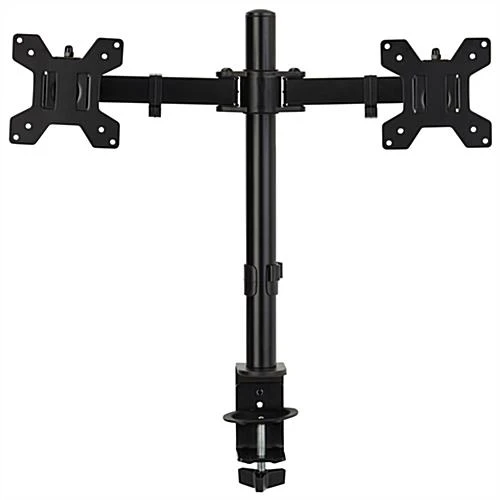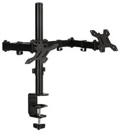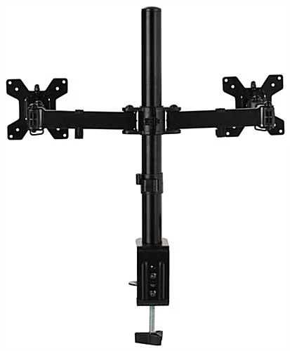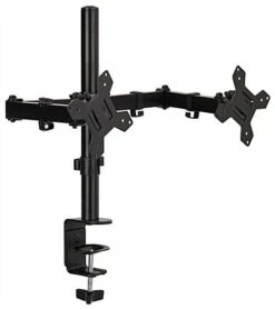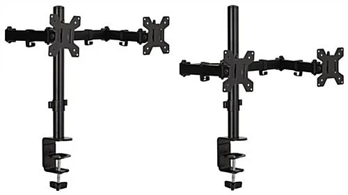 This dual monitor articulating desk mount offers two height adjustable arms, making it effortless to multitask while working in labs, schools, offices, or at home. The countertop computer screen holder features a 180° swivel mechanism and 360° rotation for the perfect viewing angle. Our height adjustable office articulating desk mount has an easy-to-use clamp-on assembly process, allowing you to install it within minutes. This desktop holder offers a – 90/+85° tilting bracket to create optimal comfort while working longer hours. These clamp-on desktop arms can fit two 13″ to 27″ tv screens with a total max weight capacity of 35 lbs. The full-motion holder can also fit 75mm x 75mm and 100mm x 100mm VESA devices, making it compatible with a wide range of computer screens. Clip this flexible dual monitor articulating desk mount to your tabletop for everyday work, classes, and meetings for a more comfortable viewing angle wherever you set up.