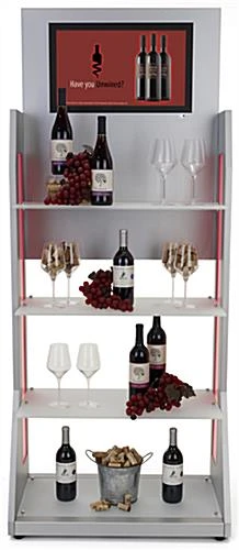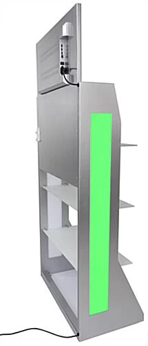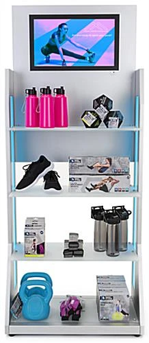 Our LED retail shelving with media player and illuminated side panels is a modern display solution perfect for department stores, high-end boutiques, liquor shops, or any merchandising space with a tech-forward focus. This digital advertising kiosk pairs brand messaging with impressive visuals and sound for an enhanced shopping experience that is sure to captivate customers. As an alternative option to traditional print signage, this LED retail shelving with media player entices your audience’s attention by vividly displaying your marketing content on a 21.5″ LCD screen with HD picture resolution. Each illuminated multi-media kiosk features a built-in Android operating system with access to Google Play store, Chrome web browser, and a slideshow app already installed. This LED retail shelving with media player also has convenient HDMI, Ethernet, and two USB ports in addition to internal speakers that support video, image, slideshow, and animation files for an engaging customer experience. Easily upload promotional messaging, brand content, or product demos to this modern digital display to increase advertising potential. The side panels on this LED retail shelving with media player have up to 15 different vibrant light color changing options as well as strobing, dimming, and speed controls that allow you to customize your showcase whenever merchandising updates are needed. Suitable for high traffic areas, this digital advertising kiosk is made up of a durable aluminum frame with a silver powder-coated finish designed to withstand years of use. This illuminated multi-media display additionally includes four white frosted tempered glass shelves to merchandise best-selling or key promotional products. Stage our LED retail shelving with media player within your retail space to create a fully modernized showcase that will make both your inventory and brand messaging stand out!