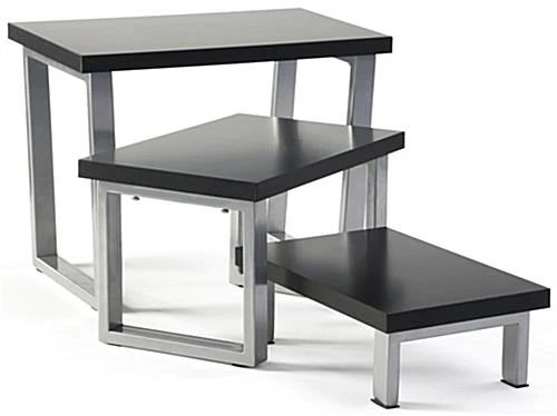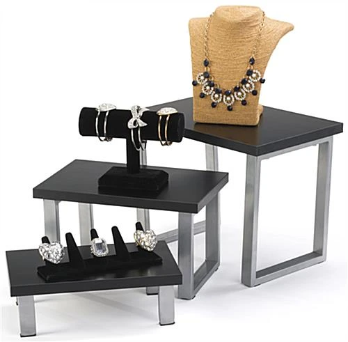 These black nesting risers create an elevated and appealing display to show off your retail merchandising. The multi level design allows more space for products on your tables while also making them easier to browse at a glance. These retail nesting risers have a simplistic, modern appeal to bring attention to jewelry, accessories, or hair products. Each size has a silver powder coated steel frame with non-slip padding that provides a stable and eye catching fixture. The top surfaces are made from medium-density fiberboard with a melamine finish to complete the contemporary style. These nesting risers turn basic retail tables into an alluring and chic arrangement. The multi level design allows customers to view all your products at once as they stand out on the delicately propped display.