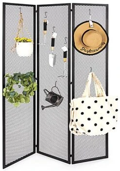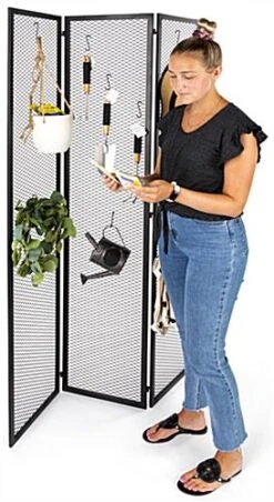 This hinged mesh retail display screen has a floor standing design with three panels that measure 15″ W x 72″ H each and can fold or expand to the full size of 45″ W x 72″ H. Great for retail stores, boutiques, gift shops, jewelers, garden centers, hardware stores, and more, this rustic-modern gridwall is a great way to create unique product showcases by hanging merchandise using S-hooks (SKU: ). This vintage-style hinged mesh retail display screen is excellent for back stock on the sales floor but is also a sleek room divider solution to create separation and privacy within spaces like beauty shops, spas, or nail salons. Our three-panel separator is made of durable black powder-coated iron with a 2mm thick grid and a 0.75″ frame for a long-lasting design. This contemporary floor standing unit is versatile, featuring a wide range of possibilities. This urban industrial hinged mesh retail display screen will instantly lend a modern-rustic aesthetic to any retail boutique, beauty salon, or gift shop!