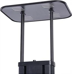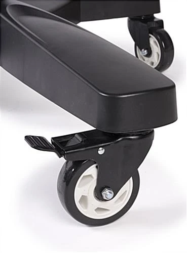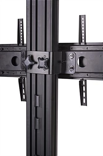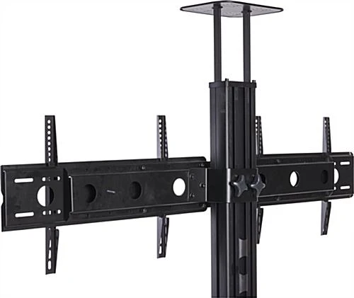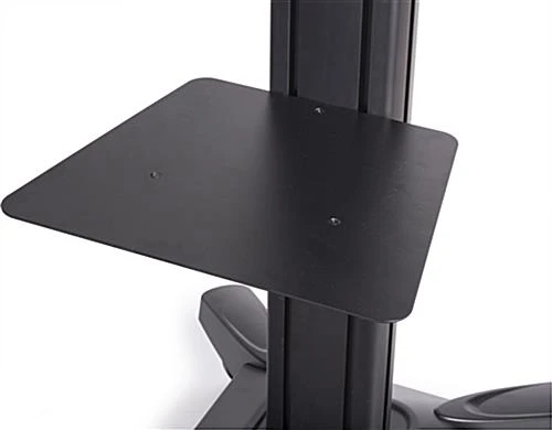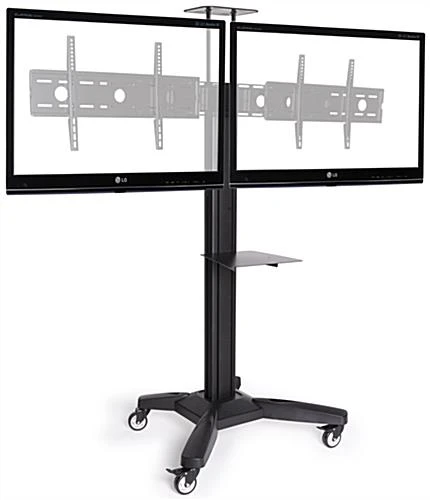 The side by side dual TV stand is an ideal display accessory for trade show and exhibition booths. The double monitor mount system accommodates two 37”-60” LCD screens up to 132 lbs. each with a maximum VESA pattern of 600×400. Although large, the rolling dual TV stand has a sturdy base that features (2) locking caster wheels which makes it easy to mobilize the cart into different positions. The monitor mount can be adjusted between 70” and 80” widths for a closer or wider LCD display. Included with this dual TV stand is an AV shelf and a camera shelf, which are both adjustable, to organize different media accessories. The pedestal’s spine is designed for full adjustability of the cart’s shelf and the bracket which can be positioned anywhere between 11” up to 67-1/2” for individual preference.