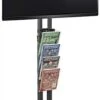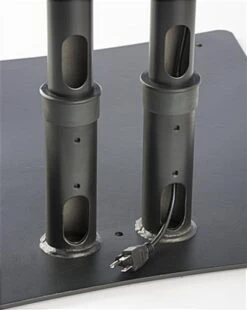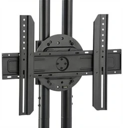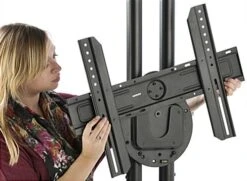 This freestanding dual TV stand supports two flat panels from 32″ to 70″ up to a combined weight of 110 lbs, making it a great option for digital signage and advertising screens. Each bracket rotates, allowing for traditional landscape or portrait viewing for more display options. This heavy-duty freestanding dual TV stand for commercial use has a stationary, weighted steel base that can be bolted to the floor for extra security, if needed. The vertical poles feature a cable management channel along the back to hide unsightly cords, making for a clean and clutter-free presentation. Flat panel displays from most manufacturers are supported, as both brackets support VESA patterns up to 600×400. Use this freestanding dual TV stand with adjustable brackets in your office reception area, at a conference hall, or to capture attention at trade shows!