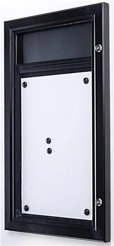 This exterior swing frame is a great information board for use in any outdoor environment. This notice swingframe, menu display case features an interior magnetic backboard for users to easily change their displayed postings and advertisements. The insert area measures 12″ x 17-3/4″ to provide users plenty of space to hold (1) 11″ x 17″ page. To make the message board more enticing, each unit also includes a top area for displaying additional messages. This menu display case that has a header space enables businesses to advertise company logos, headlines or attention grabbing captions. Users can use the magnets provided with the unit to attach their printouts. This wall-mount menu display case, such as a bulletin board and wall-mount frame, also has a swing-open door for easy access. At the side on the unit, there are two support rods to keep the door open for users to easily post their printed messages.