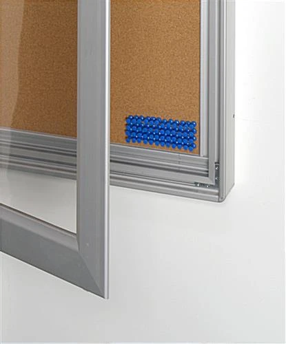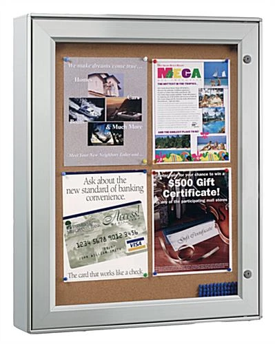 Tackboards are used for announcements or important information. Menus, sales, and upcoming events are just a few of the many signage possibilities. We supply these tackboards and other announcement boards available for you online. The unit can be mounted 2 different ways; hinges on the right or left, giving you variety when it comes to installation. Quick sign changes are much more feasible with the easy open swing doors. Adorn the cork boards to a wall in either landscape or portrait format depending upon the orientation of the displayed signs. Our tackboards are priced right as compared with other more expensive tackboards and pin boards. A set of pushpins is also included so advertisers can begin as soon as they receive the unit. View tackboards online here!
