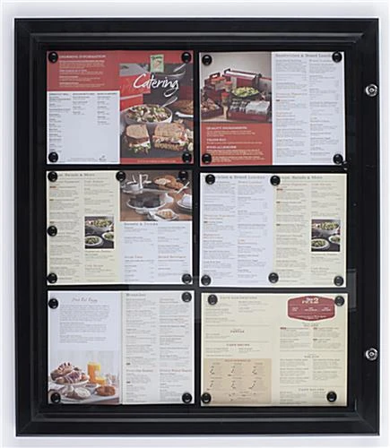 This outdoor restaurant menu case is a great way to post announcements outside an establishment. The bulletin board effectively communicates important information to passersby. This outdoor wall swingframe, restaurant menu case is fabricated from aluminum extrusion with a powder coated black finish. Each unit has a 23-1/2″ x 27-1/2″ black magnetic surface that can be used to hold (6) standard 8-1/2″w x 11″h size sheets. This bulletin board, restaurant menu case can be used to display landscape or portrait style menus, directories, event listings, business hours or other important information. Users can easily change the prints on the display with the included magnets. This restaurant menu case that has a swing-open door permits easy access to the postings. Users can use the rod inside the frame to keep the door open during the change-out process.
