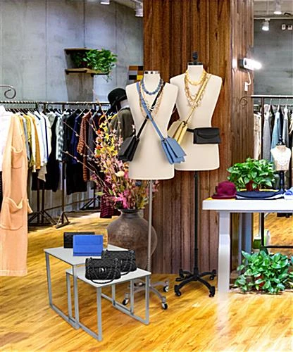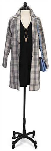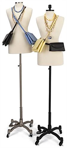 Our professional female dress form is the ideal fixture for showcasing the latest in women’s fashion within retail stores, specialty boutiques, designer showrooms, and more. This height-adjustable fabric mannequin features an industrial yet modern design that stands out from other fixtures while also effortlessly blending in with any space’s décor. Perfect for merchandising your brand’s most popular women’s clothing and accessories, this lightweight female dress form can easily be carried and moved around your space for quick visual updates. Made of a high-density polyurethane foam torso covered in ivory cotton knit fabric with a matte black metal base and neck finial, each half-body display will hold up to the conditions of a busy shopping environment throughout many years of use. This female dress form with rolling base is fully pinnable, allowing you to pin and adjust clothing to accommodate your merchandising needs. As an added benefit, this height-adjustable fabric mannequin can be modified to stand anywhere from 51 to 90.5 inches tall. Place this half-body display within storefront windows or throughout your selling floor to create an eye-catching showcase that captures the attention of passersby!