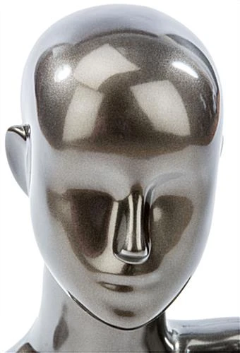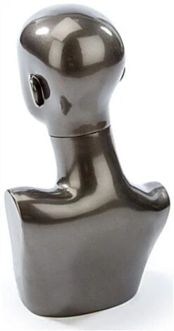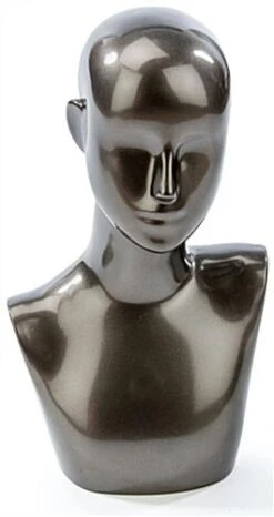 This pewter female mannequin bust is a great countertop dress form for any retail setting, large or small. Each store display figure measures 18.75”h which provides ample space to showcase a variety of fashion accessories. The mannequin bust with abstract facial features is a great fixture for promoting new sales and high trend items such as sunglasses, scarves, hats, wigs and hairpieces! Use the mannequin bust to bring attention to all kinds of store merchandise! Buy a fashion figure to show off a wide variety of retail items!