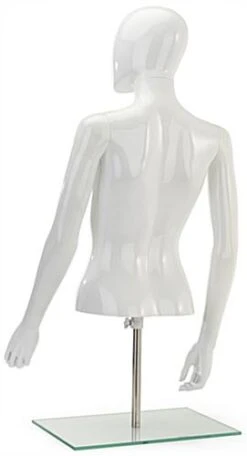 The glossy white torso mannequin with stand and abstract head is perfect for showcasing clothes and accessories in retail, boutique and department stores.