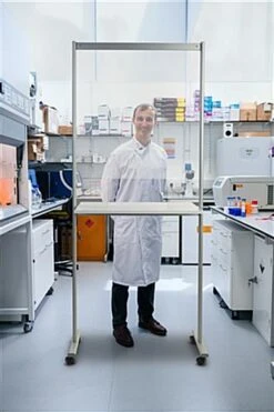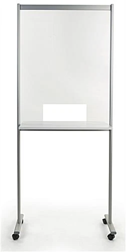 This portable acrylic sneeze guard with hygiene door is a wonderful solution for added safety during employee and client interactions when physical distancing is not an option. This sanitary divider has a convenient white MDF countertop built-in, making it great to take notes, sign documents, or use your computer on in hospitals, dental offices, corporate workspaces, labs, universities, and more! This clear portable acrylic sneeze guard with a hygiene door has a durable aluminum frame for a long-lasting build. You can also choose to connect multiple units together to create a larger configuration. The mobile design with four wheels makes it easy for you to move your shield from room to room throughout the day as you meet with different patients or change between lecture halls. This clear sanitary divider portion of this unit measures 32.4″ W x 40.75″ H with a 15.75″ W x 7.8″ H transaction slot for added convenience. The overall dimensions of the floor standing mobile shield are 35.43″ wide by 78.75 tall with a depth of 19.7″. This freestanding portable acrylic sneeze guard with hygiene door will make it easy to enforce physical distancing in smaller spaces like exam rooms, dental offices, classrooms, and laboratories to help lower the chance of spread of dangerous viruses.