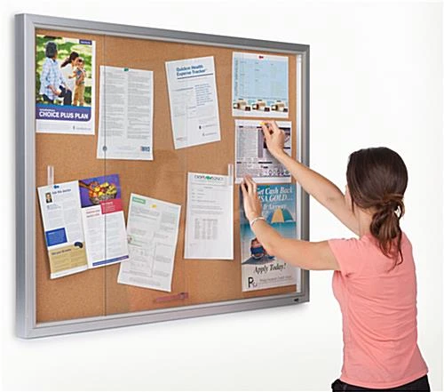 A glass enclosed bulletin board, like indoor corkboards and wall-mount message cabinet, is perfect for locating anyplace where there is heavy foot traffic. The notice display is ideal for use in a classroom or teacher work room for displaying time tables, schedules or upcoming events. Government agencies, hospitals, churches, and post offices can also use this aluminum glass enclosed bulletin board to show essential postings. Whether it is for business or an academic establishments use, this corkboard is an ultimate message center. This notice display cabinet, glass enclosed bulletin board incorporates two shatter resistant sliding tempered glass doors, which permit rapid changes and easy poster placement. Messages can be updated monthly, weekly or even daily with no hassle! This sliding glass door, enclosed bulletin board that comes with a locking mechanism will keep the information secure, yet clearly show the messages to the public. The unit is also sold with hanging brackets and essential mounting hardware for uncomplicated and fast wall-mounting. Once this indoor corkboard is mounted on the wall, users can conveniently change out their message with the sliding door case. This notice display cabinet is available in a larger version as well (see related products on the right hand corner for more options). An indoor aluminum corkboard, like the one seen here makes an excellent communication tool for both public and private institution.