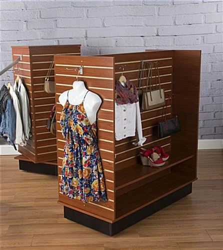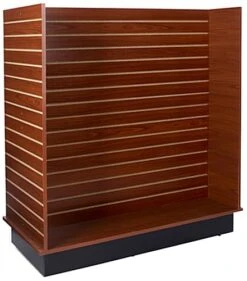This slatwall display unit will bring functionality to your retail store with its 4 sides. The cherry gondola features 15 channels per side with 3” spacing in between each. With hidden casters underneath, the retail store display unit can be effortlessly moved around. Its large size and durable melamine panels make this piece a necessity when promoting your products. The display unit features a 51”W x 55”H H-shape design. This fixture is compatible with most standard gondola accessories.