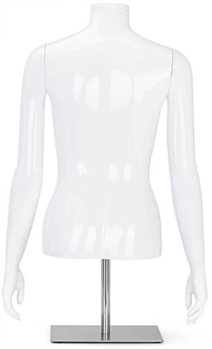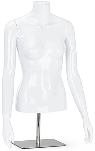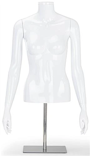 Our headless female mannequin torso features a stylish glossy white finish that complements existing fixtures and any retail store decor. This abstract half body figure is perfect for merchandising clothing, accessories, promotional items, and more at boutiques, showrooms, or shopping centers. Constructed of recyclable polypropylene plastic with a weighted metal base, this female mannequin torso is lightweight enough to move from tabletops to storefront windows with ease. Each glossy white fashion display has detachable and rotating arms that allow you to quickly update this bust with products like shirts, sweaters, or jackets as new garments come in. As an added benefit, our female mannequin torso is height-adjustable, ranging from 23.25″ to 39.5″ tall, resulting in a fully versatile fixture that can be easily modified to meet your merchandising needs. Place this abstract half body figure within your retail space to increase the visibility of your best-selling merchandise and captivate shoppers as they browse by today!