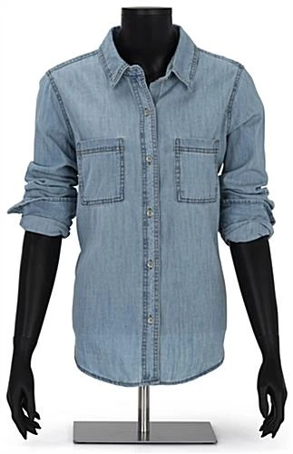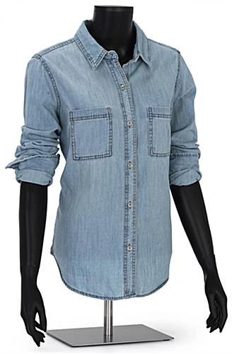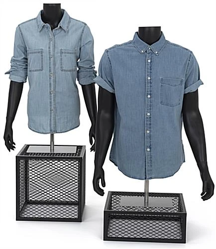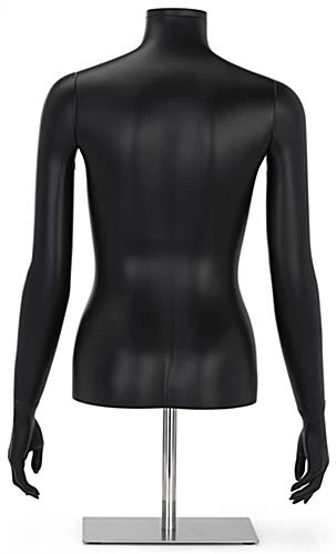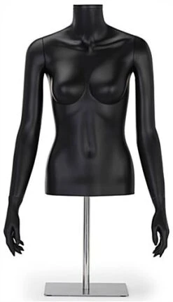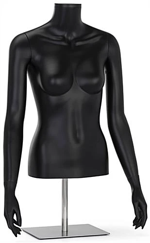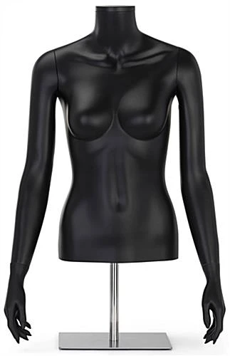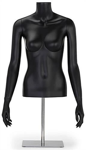 Use this realistic female half-body torso to grant customers maximum visibility of your best-selling women’s apparel and accessories from all angles. This abstract tabletop mannequin features an ultra-modern matte black finish giving it a unique and stylish look that stands out while allowing your merchandise to be the focal point of any showcase. Great for retail stores, boutiques, or showrooms, this female half-body torso features removable arms and a headless design that allows you to make quick visual merchandising updates within minutes! Made of heavy-duty polypropylene plastic, each matte black mannequin figure is durable enough to withstand the conditions of a busy shopping environment and can beneficially be recycled after many years of reliable use. Additionally, this female half-body torso with a height-adjustable metal base has the ability to be set to different heights ranging from 23.25″ and 39.5″ tall to accommodate any tabletop display. Place this headless abstract mannequin in your retail space to create an eye-catching merchandising showcase that captures the attention of passersby!