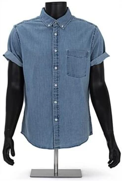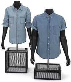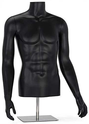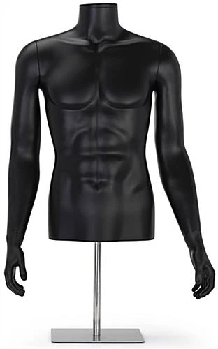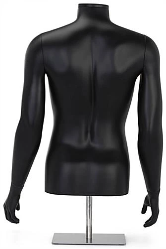 This mature male half-body mannequin is a modern and unique visual merchandising display solution, perfect for showcasing shirts, sweaters, or jackets in your retail space. Made of durable recyclable polypropylene material with an attention-grabbing matte black finish, our abstract torso figure will be sure to grab the attention of your audience while allowing your best-selling garments to be the main focus of any presentation. Ideal for busy environments such as boutiques, showrooms, retail stores, and shopping centers, each male half-body mannequin with headless design features a weighted metal base that securely keeps this fixture mounted in place. Each tabletop merchandising display is constructed with accented muscles and fully formed hands, giving off a realistic appearance that allows customers to visualize how the apparel would look like on the human body. Removable arms and a height-adjustable pole ranging from 23.25″ to 39.5″ tall allow this lightweight male half-body mannequin to be easily dressed and modified to meet your merchandising needs. Stage our headless tabletop torso figure within your establishment to create a fully modernized visual showcase that will make your best-selling merchandise stand out!