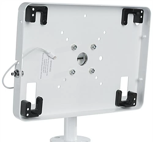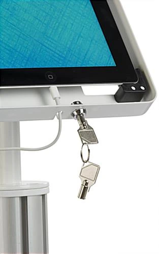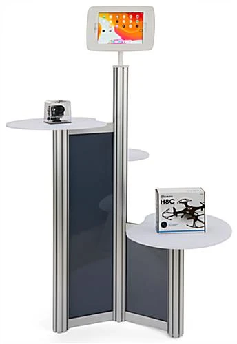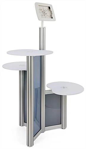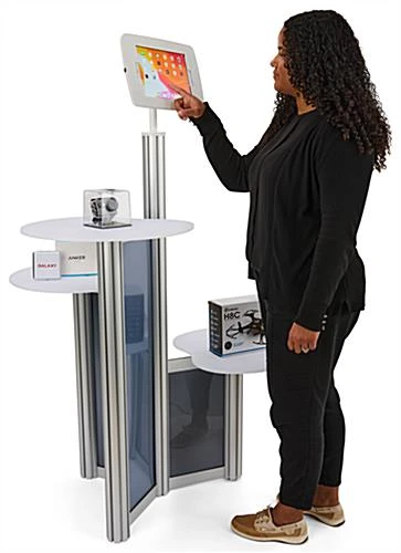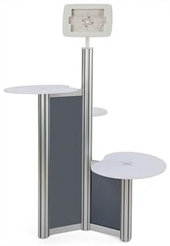 This iPad retail display stand incorporates digital advertising through the tablet enclosure and physical presentation with the 3 acrylic tabletops for custom product exhibition, making it an ideal trade show or retail fixture. Created with an anti-theft security lock and key, the design gives you ease of mind to leave the fixture as long as you need. The multi-functional iPad stand allows you to place custom samples or promotional items on the podium tables while simultaneously streaming a content video of how it was made or the exciting new items coming next month. The tablet’s front and rear cameras are fully functional along with the head phone jack and speakers, allowing your customers to interact with it while it is safely locked into the enclosure. Place this iPad stand in the midst of a busy trade show or hectic mall to promote your business using content videos, as well as an up close look of the items on the 3 acrylic tabletops. The table includes a figure-8 cord that plugs into your USB adapter on top and runs through the hollow center pole exiting through the base, keeping your tablet running as long as your store is open.