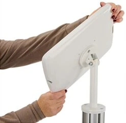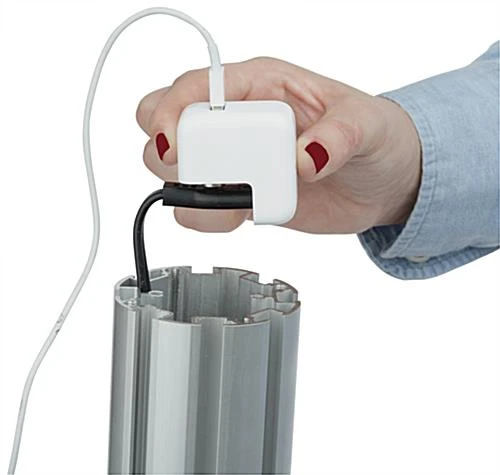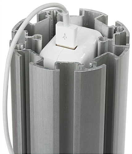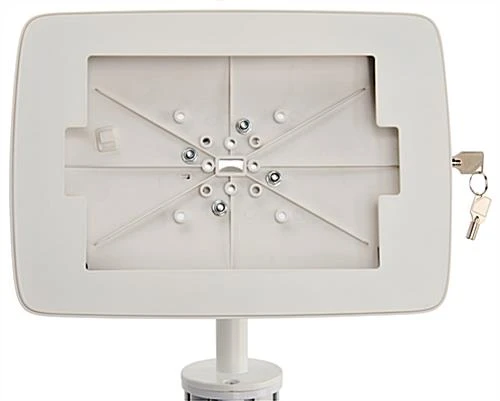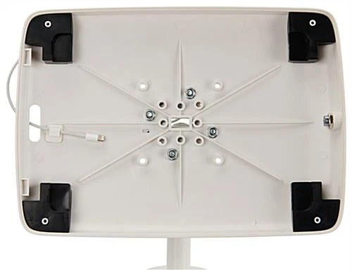 This iPad display table is perfect for any trade show or exhibit to advertise bold video tutorials, as well as offer handouts with the 8.5” x 11” literature holder. Included is a figure-8 cord that plugs into your personal USB charger, runs through the aluminum post and exits the bottom, allowing for continued seamless charging within the rotating enclosure. The floor standing iPad table securely holds your device under lock and key, so that you are free to check out competitors at that trade show or view from afar for reactions to your tech-savvy presentation. Now you can walk away as long as you’d like knowing your tablet is safe in the locked enclosure while your business brochures are proudly presented. Each floor standing fixture will continuously stream your video and with the home button exposed you can adjust your presentation at any time. The iPad table stands 39” high with one acrylic tabletop, allowing customers to view physical products as well. The enclosure features an opening for the front and rear facing cameras as well as an accessible head phone jack, making for a fully functional tablet even while it is locked in place.