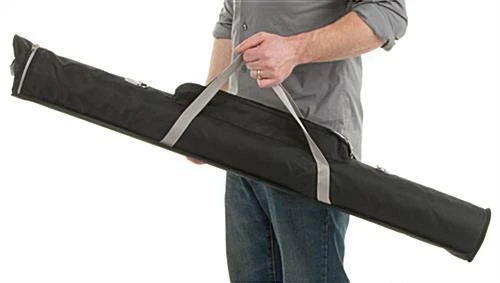 This vinyl banner stand has an L-shaped design that is both stable and easy to set up. The floor-standing fixture measures 80.25 inches tall and is sold with a custom latex printed vinyl banner that measures 39.5 inches wide by 78.75 inches tall. Simply download the template and submit artwork during or shortly after checkout. The L-shaped banner stand is designed with portability in mind. The 3-piece display sets up in minutes by simply connecting the pole to the base, the graphics to the banner rails and the rails to the pole. In-between uses, the entire fixture stores within the black canvas carry bag.