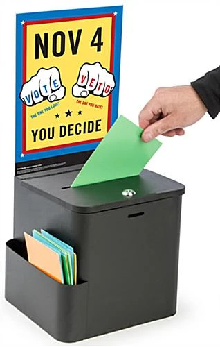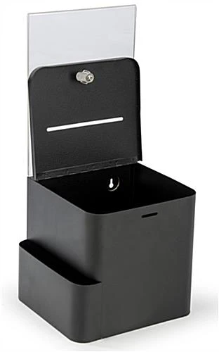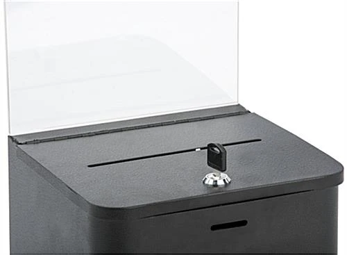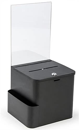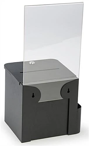 This black ballot box with sign holder is a simple and great way to gather personal and anonymous information in any public place. The bin includes a side card pocket, locking hinged door, keys, wall mounting hardware and acrylic display for signage. The locking ballot box and side compartment has a black finish and clear acrylic frame. The top frame holds instructions or branding information tightly and can easily be removed if there is no purpose for the acrylic display. These style bins also work great for collecting entries for contests.