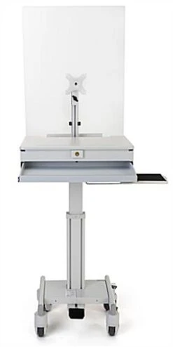 This medical computer workstation with protective barrier helps keep nurses and patients shielded from viruses and airborne particles at healthcare facilities. Keeping medical professionals and clinical workers protected and ensuring the safety of your hospital staff is easy with this height adjustable device cart with acrylic sneeze guard. The medical computer workstation with protective barrier features a locking wheelbase design, allows nurses to position it exactly where they need it in their healthcare facility. A foot pedal controls the height adjustable device cart so that the acrylic sneeze guard rests at the correct place to protect nurses and medical professionals from airborne particles. The built-in locking drawer provides extra safety and the keyboard and mouse tray provides practicality – the functional design makes this device holder one of a kind. Use this medical computer workstation with protective barrier to help stop the spread of the coronavirus while at the same time using it to work efficiently at the office.
