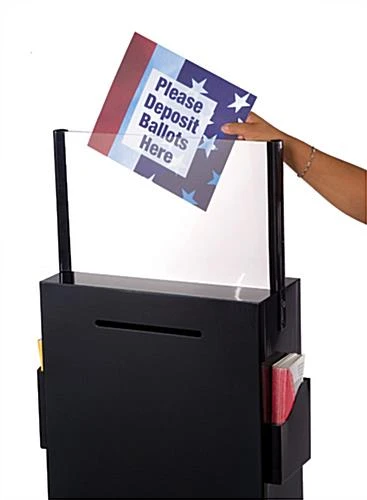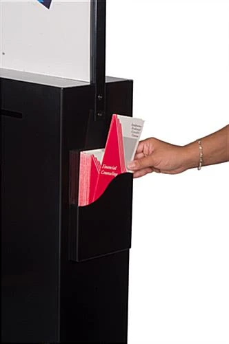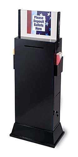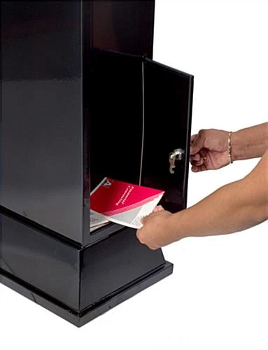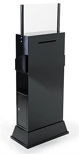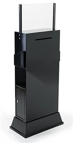 These comment boxes feature two brochure compartments for providing additional information. These comment boxes, like locking ballot stands, and free standing suggestion boxes, come with a locking door for accessibility. The material inside will be stored securely in the comment display. We provide the comment boxes with two keys as well. Information and materials can be easily inserted from the entry slot at the top of the comment display. The compartment is very spacious to hold numerous forms, business cards, tickets or letters. These comment boxes are suitable for use in restaurants, bars, hotels, casinos, retailers and banks.