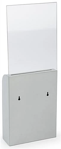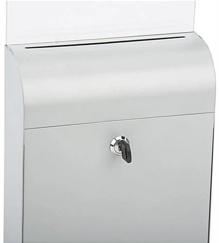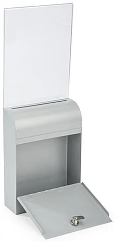 This silver wall mount document box can be used for comments, voting purposes or even collecting donations and information for raffle events. The modern design is perfect for any business or public event with a slim design. Each lockable document box is made with metal and includes a strong lock with two keys to secure personal and private information. The 8” x 11” clear acrylic sign holder can easily be removed if constricted on space or not applicable for use. A document box can be displayed on a table or hung up and it includes all hardware necessary. The clear acrylic sign holder and lockbox has a simple design making it easy to replace graphics and to remove donations or information.