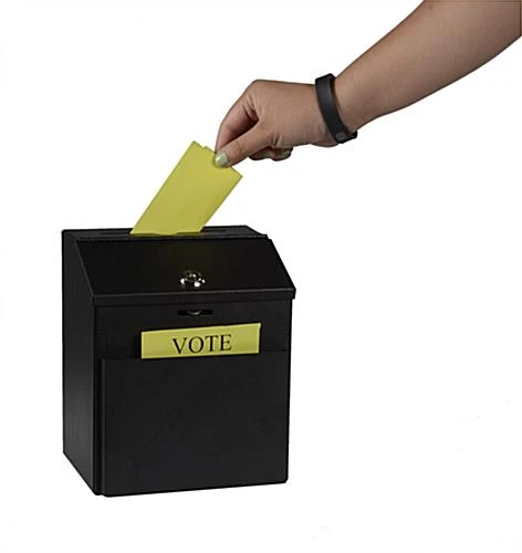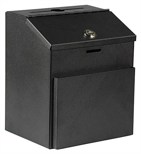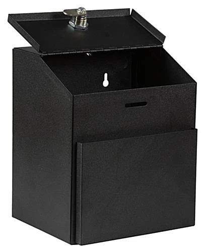 This 7-1/8″ w x 8-1/2″h metal donation box is easy to transport from event to event. Use this ballot holder to gather feedback from employees or patrons. This versatile metal donation box can also be used to collect entry forms for a contest. The suggestion holder shown here, allows comments to be anonymous, making it more likely for the assessments to be truthful. Each metal donation box that has a textured black finish fits with most environments. This lockable collection bin keeps contents safe. This ballot holder, metal donation box allows any establishment to gather suggestions for improvement or entry forms in a discreet and secure manner.