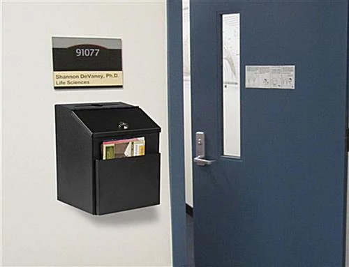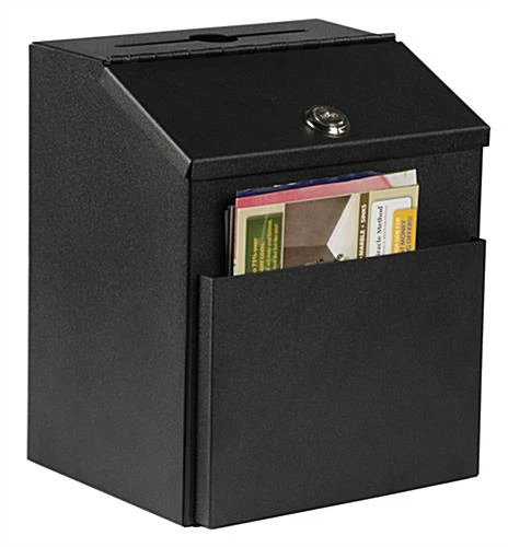 This metal donation box, also known as a comment holder, is ideal for collecting donations and suggestions. Use this collection bin in a wide range of environments including school functions, church events, and offices. This metal donation box that features a front pocket is ideal for holding suggestion forms or donation envelopes. Each ballot box will keep donations and suggestions safe. This metal donation box that has a locking top with a set of (2) keys is great for collections in public places. These comment suggestion holders can sit on tabletops or hang on walls. The required hardware to mount this metal donation box is included.