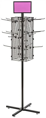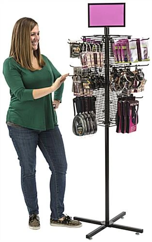This rotating grid rack with 8” pegs allows merchandise to be hung using long adjustable hooks which affix to the wire display. Create a configuration that comfortably showcases products which may vary in size. Turn the black powder coat finished center square grid rack which revolves fully to accommodate viewing from all sides. Construct a wire display to best suit your business and choose between a stationary holder with 4 levelers and a mobile store fixture with 4 casters. Advertise for the hanging products with the top loading header that is removable. With 20 black hooks supplied, there are an abundance of fixtures to stack and store products on when using the grid rack.