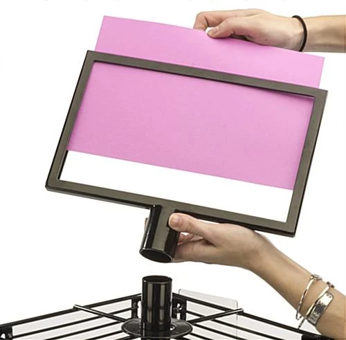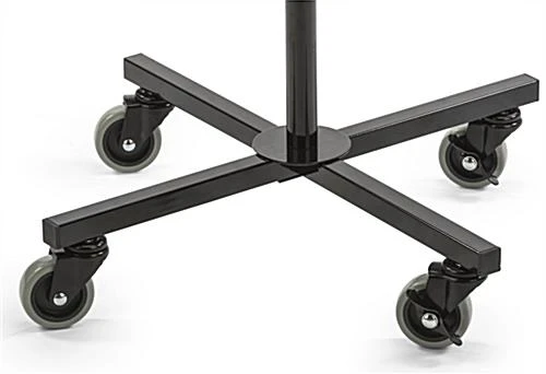 This rotating grid rack is a floor display ideal for retail store environments. Constructed from black metal wire, each stand is fully revolving. Utilize the grid rack display with hooks or pockets (not included with purchase) to complete an impulse shopping station. Advertise sales and deals with the top loading removable sign holder. Equipped with 4 base levelers and 4 optional casters, the grid rack is versatile in design allowing for a spinning stationary or mobile floor display stand. Square center wire panels provide 4 panels to spin and showcase retail store merchandise simultaneously.