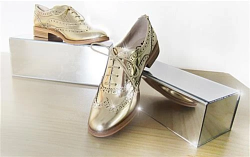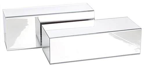Sold as a set of 2, these mirrored risers offer a unique acrylic display for a more intricate presentation approach. Both rectangular fixtures are the same size, providing an ideal option for shoes or paired accessories. Utilize any of the 6 full sides of each rectangular riser, as they are solid units and can be positioned on all planes for varied heights. Set the acrylic display within a display case or on a nesting table to create a showcase that is either staggered like a tiered stair or uniformed at the same level. Full art arrangements, scented candle options, or featured jewelry pieces can all be beautifully positioned upon the reflective surfaces, providing alternative angles to be showcased seamlessly. Freely arrange these risers as an alternative to a standard acrylic display for more versatility.